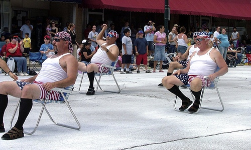 The Lawn Chair Dads are a group of 30 friends from McHenry County who got together back in 1994, choreographed a special lawn chair show in military formation and perform dressed in boxers, tank tops, black socks and sandals. They’ve been called the “most sought after parade act in Illinois” and here’s a video preview: