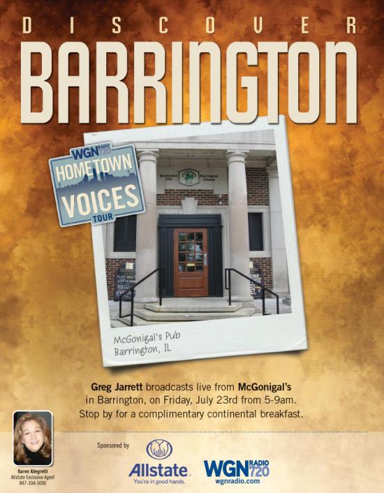 WGN’s coordinator for tomorrow’s event says they selected McGonigal’s as the location for their LIVE radio broadcast because it’s right in the heart of downtown Barrington. WGN started this series of hometown radio broadcasts to show that “…the best things in life lie just off your front stoop.” Radio host, Greg Jarrett, will be broadcasting LIVE at McGonigal’s from 5 to 9AM along with news anchor, Andrea Darlas and Sports Director, Dave Eanet.