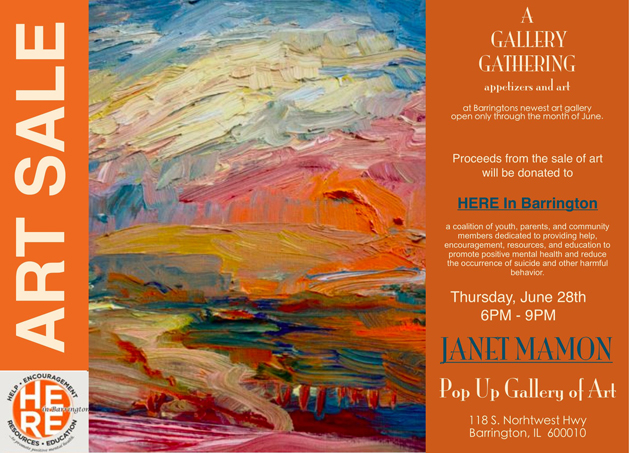 At Janet’s Pop Up Gallery, you will see over 130 of her paintings in oil on canvas ranging in size from 4 x 4 to 9 feet high by 7 feet wide and ranging in price from $25 to $8,000. She is best known for her landscapes, skyscapes, abstracts, still life and figurative art. To meet the artist, view her work and get to know her philosophy about the healing power of art and meditation, drop by her gallery gathering from 6 to 9 p.m. tonight, Thursday June 28th, at 118 S. Northwest Highway. It’s in the space right next door to Starbucks. She’ll be serving wine, coffee and appetizers and she hopes to see you there! To learn more about Janet and see her work, visit her website at JanetMamon.com and to learn more about the work of HERE in Barrington, visit HEREinBarrington.org.
