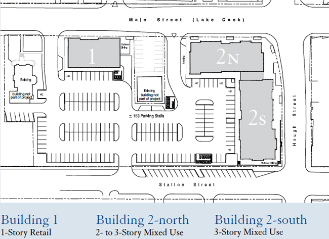 Building 1 is a one-story, 6,000 square-foot retail building (just west of M.J. Miller Jewelers). Buildings 2N and 2S (on the Hough/Main corner) are up to three-story buildings that connect on the office floors by a pedestrian walkway from the corner of the parking lot. The site will also provide over 150 parking spaces.