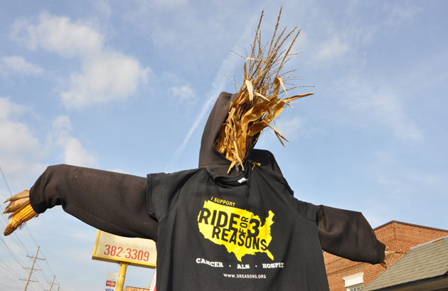 There are only a few days left to vote for who you think should win the Village of Barrington’s annual scarecrow design competition. So we have time for one last Spot the Scarecrow mystery photo contest. One Barrington business designed their scarecrow with a Ride for 3 Reasons theme this year in honor of Bob Lee, who is wrapping up his 2,000 mile bike ride down the Pacific coast this week.
