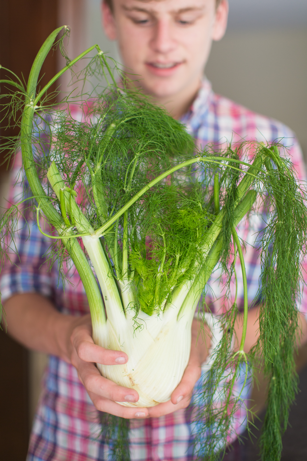Tonight we also made a Fennel Slaw to serve with and on our dogs. It’s light and fresh with just the right amount of crunch then a hint of sweetness from the apples. I noticed at the market that the tops were cut off the fennel so I asked if they had any uncut and sure enough they did, The feathery fronds have great flavor.