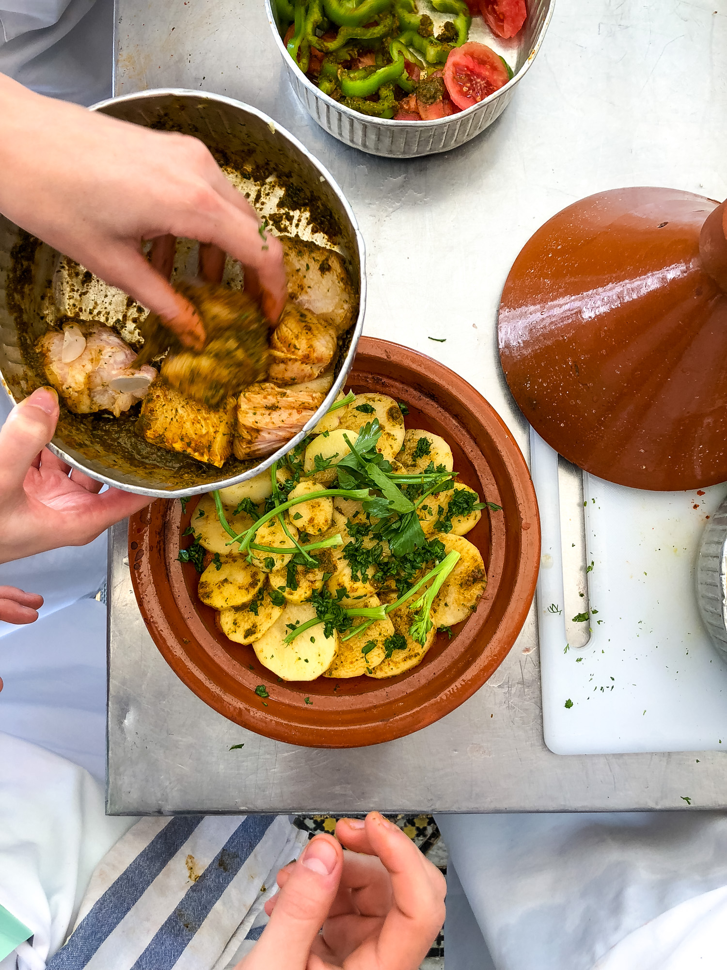 - Coat first the potatoes then the green peppers and lastly the tomatoes with the remaining chermoula