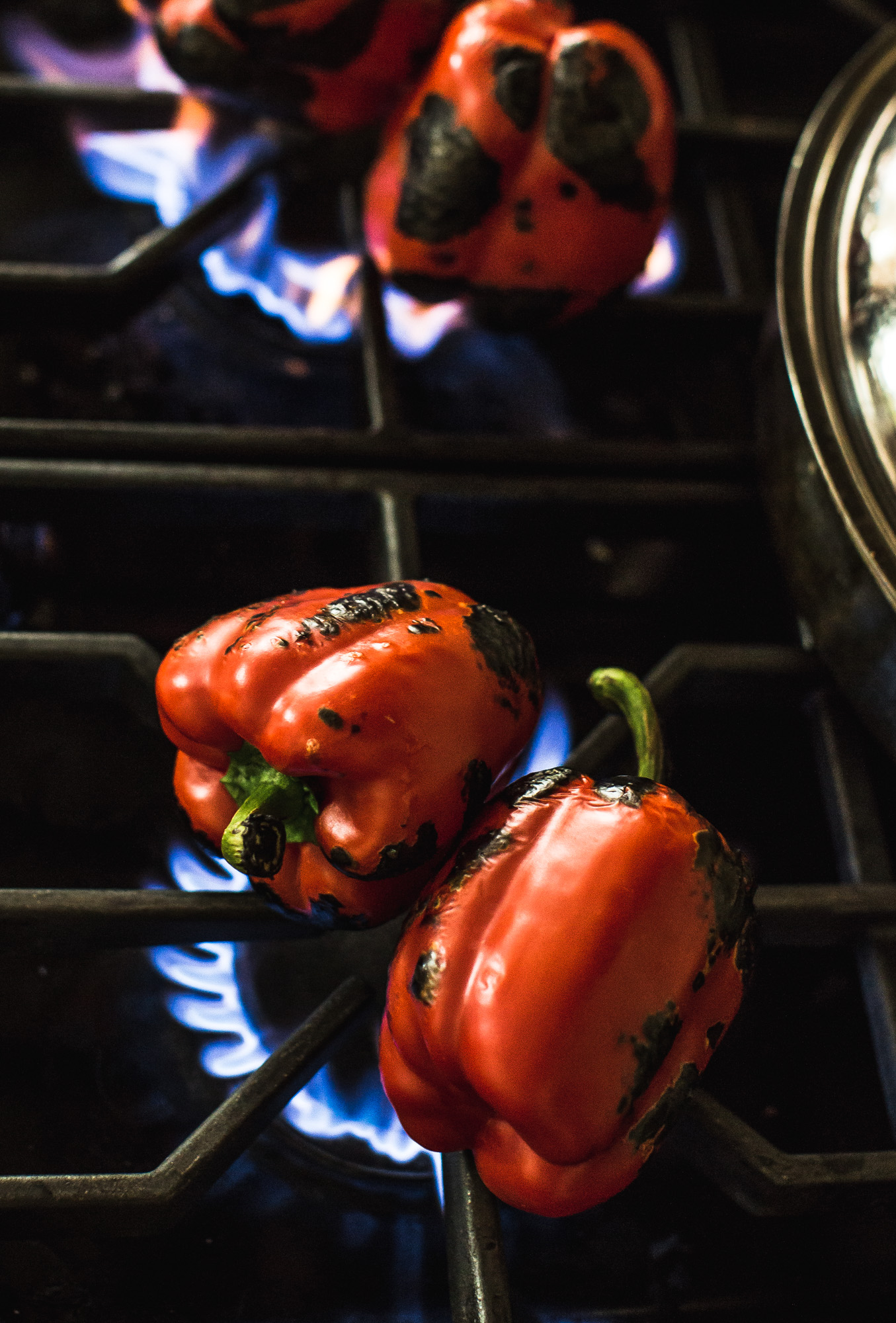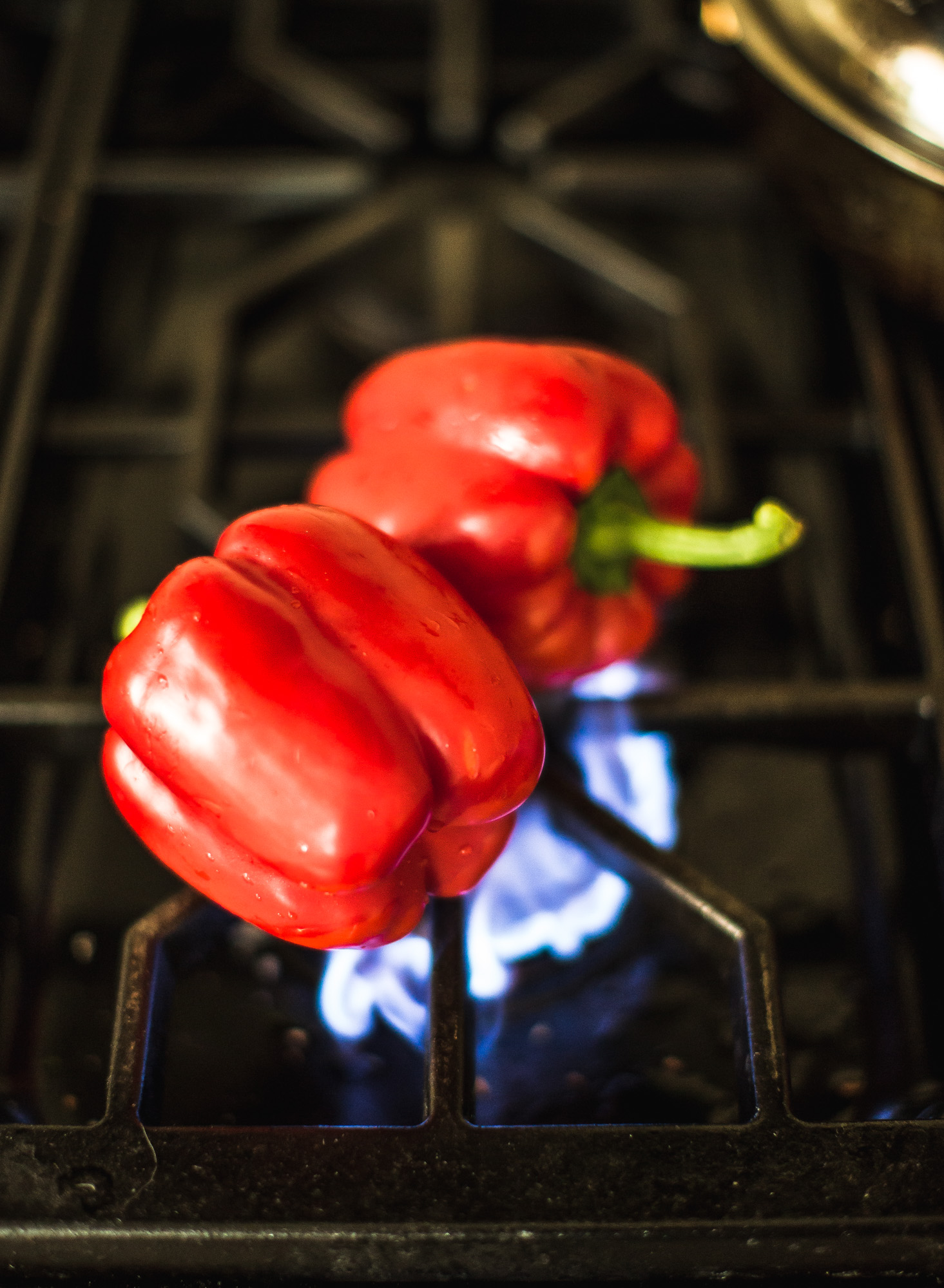 When roasting the red pepper, simply place the washed pepper directly on a burner with a high flame. Once the flesh starts to blacken, turn until all sides are charred.