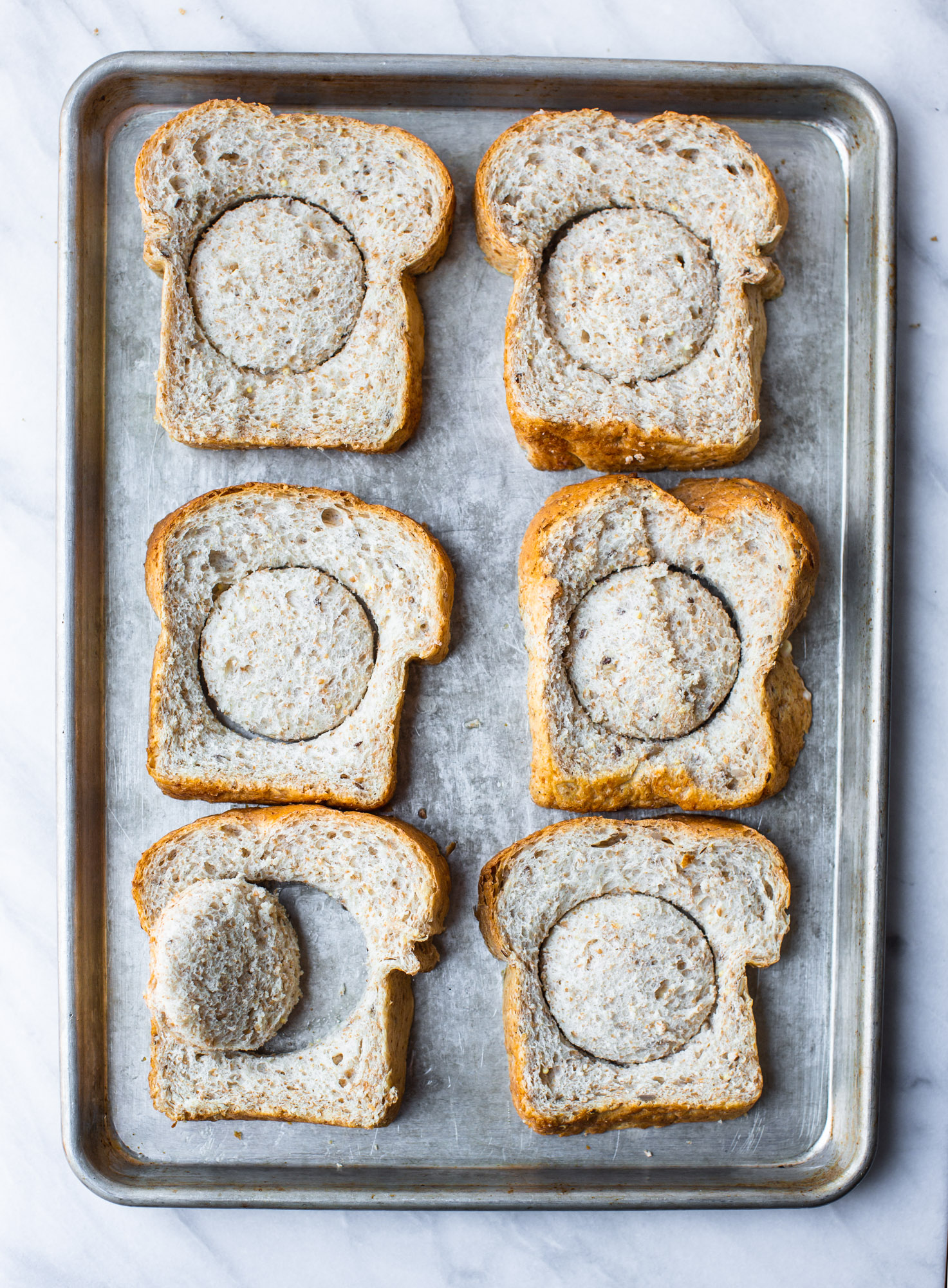 Today we’re making sheet pan Egg in a Hole. The frying pan is great if you are cooking for one or two. If you have a crowd like I do, preparing 6 at a time on a cookie sheet just makes more sense. And it’s even EASIER! yeah!!!