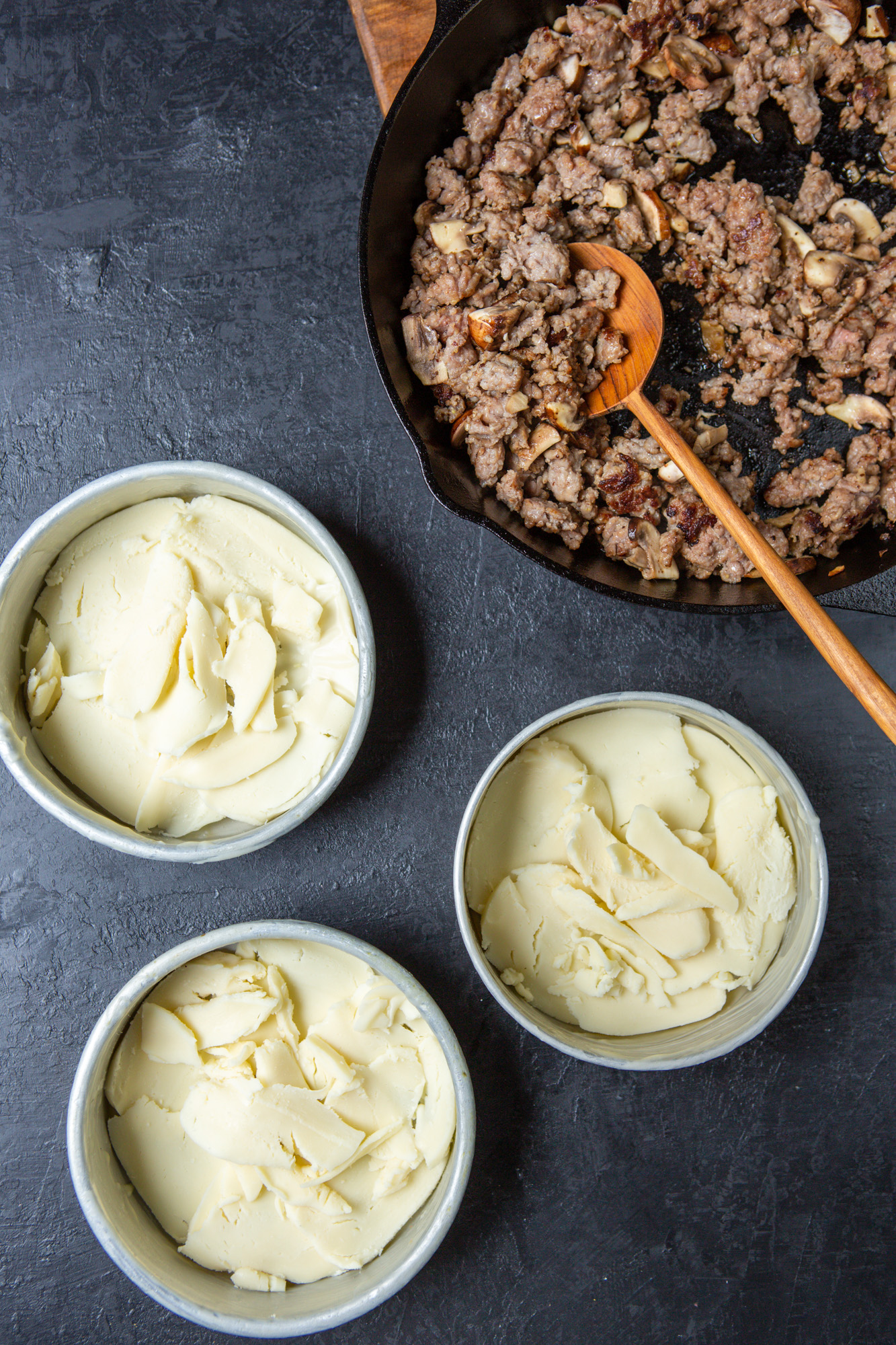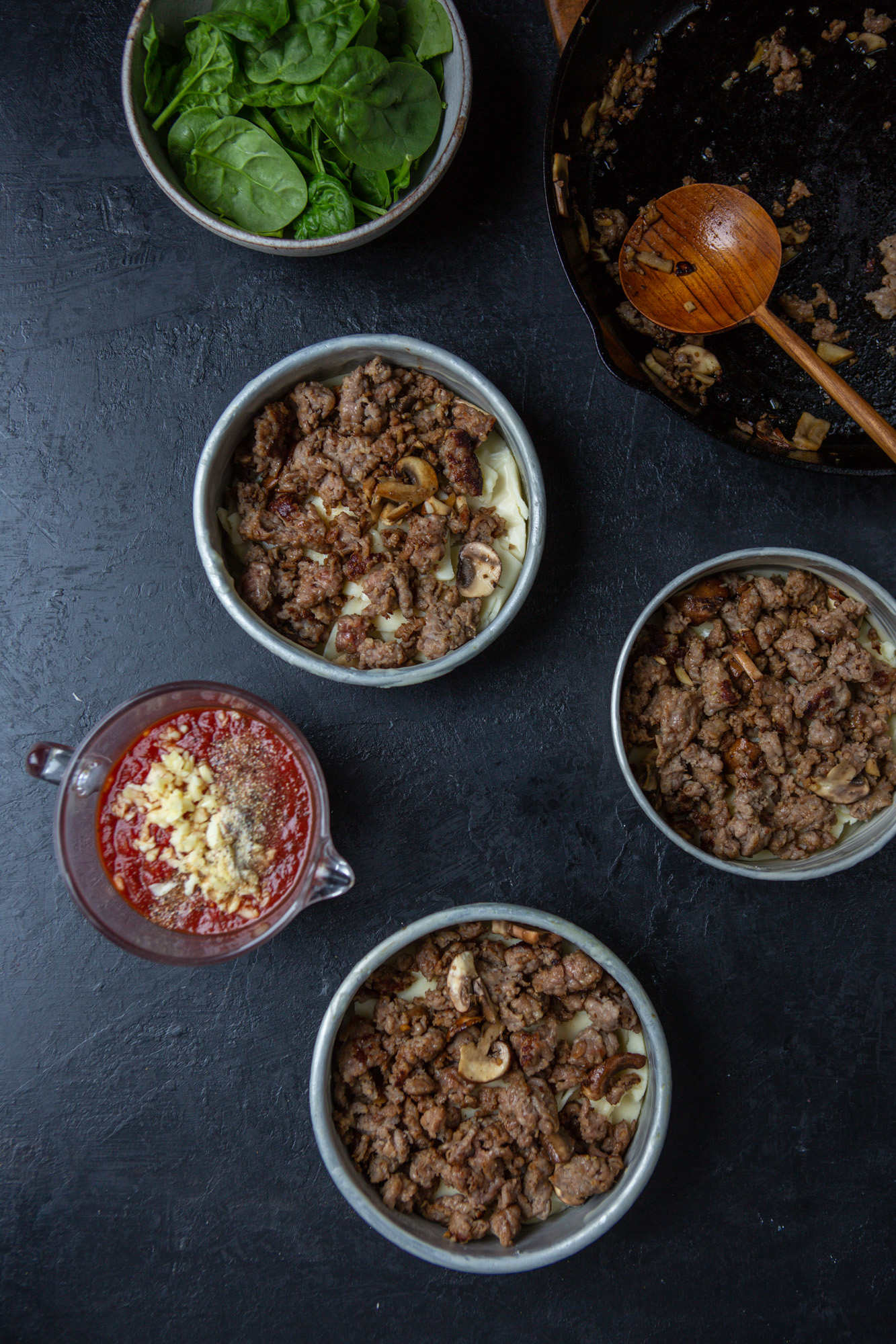 - Cover the entire inside of the ramekins with slices of mozzarella cheese (don’t skimp!), then add browned Italian sausage, sliced mushrooms, and Canadian bacon etc.