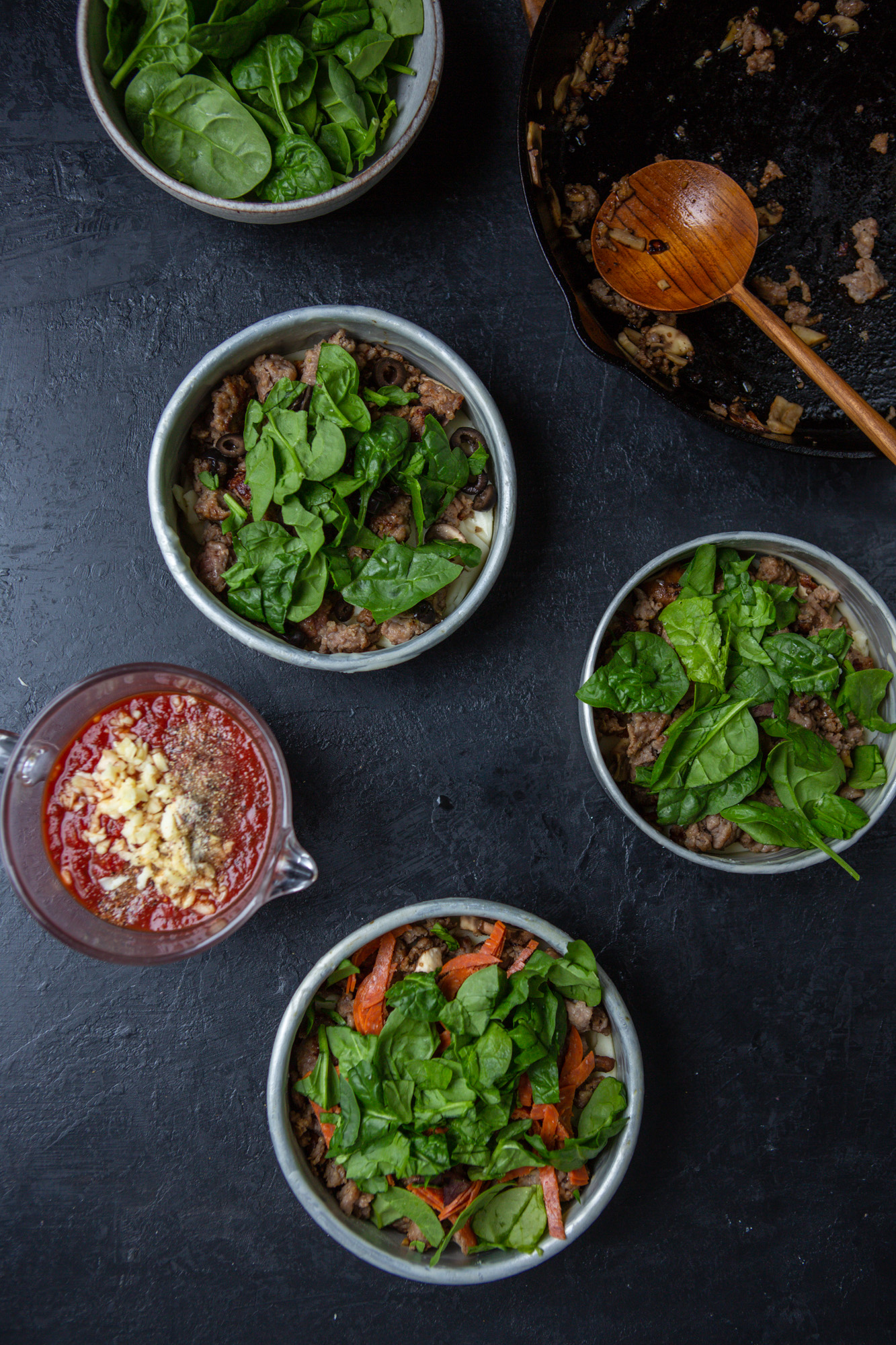 This recipe is fun, easy and unique. It’s kind of a hybrid. As if Stuffed Crust Pizza met a deep dish pizza. Because we’re making them in a single serving sizes and because the crust is laid over the top it takes much less time to cook. Once they are assembled they cook for 10-12 minutes at 400°.